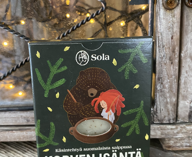 Tässä saippuassa on kuusenkerkkää, nokkosta ja koivun lehtiä Pohjois-Karjalan metsistä. Eteeriset öljyt tuovat myyttisiä tuoksuja Tapion valtakunnasta.
